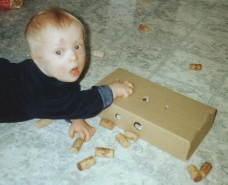 Unsere Weinflaschenkorken sind eine ganze Weile nicht mehr in Sammelstellen gewandert, sondern bei uns geblieben. Dann haben wir einen mittelgroßen Pappkarton mit runden Löchern unterschiedlicher Größe versehen: gerade passende für einen Korken, größere, aber auch kleinere. Dieses Spielzeug mag Elias lieber als einen der handelsüblichen Shapesorter.