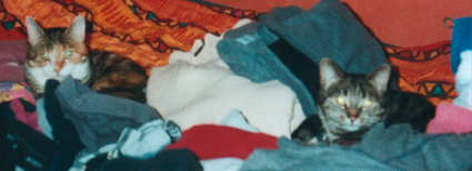 Unsere Katzen Mona und Lisa in einem Wäscheberg im August 2002. Bei beiden wissen wir nicht, wann sie genau geboren wurden. Da es bei beiden Ende März/Anfang April gewesen sein muss, haben wir den ersten April als Geburtstag festgelegt: Lisa (rechts) kam 1993 zur Welt und Mona 1996. |