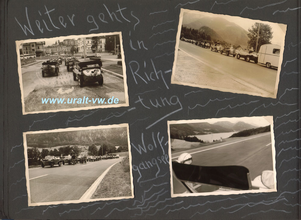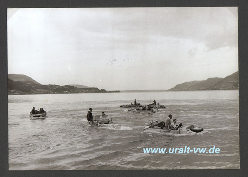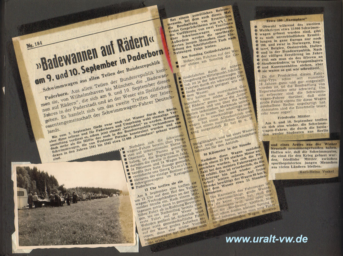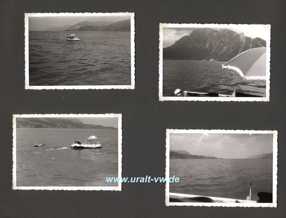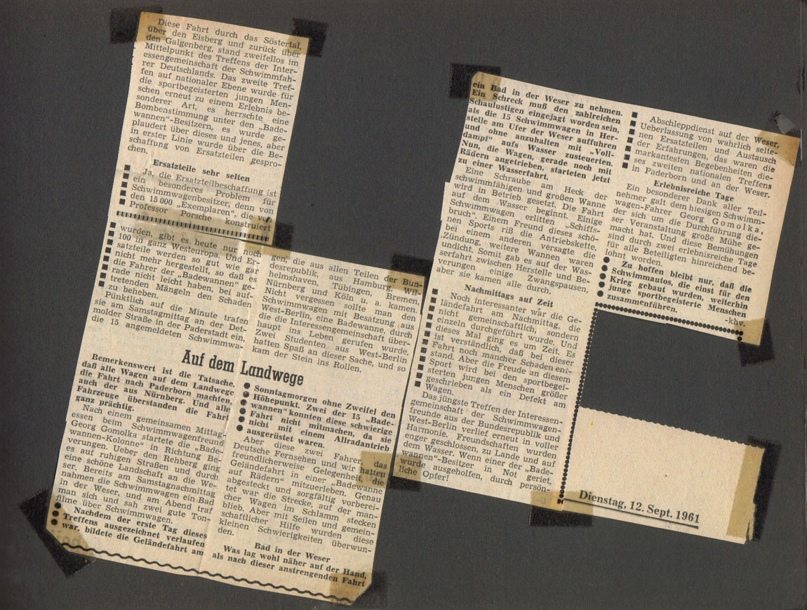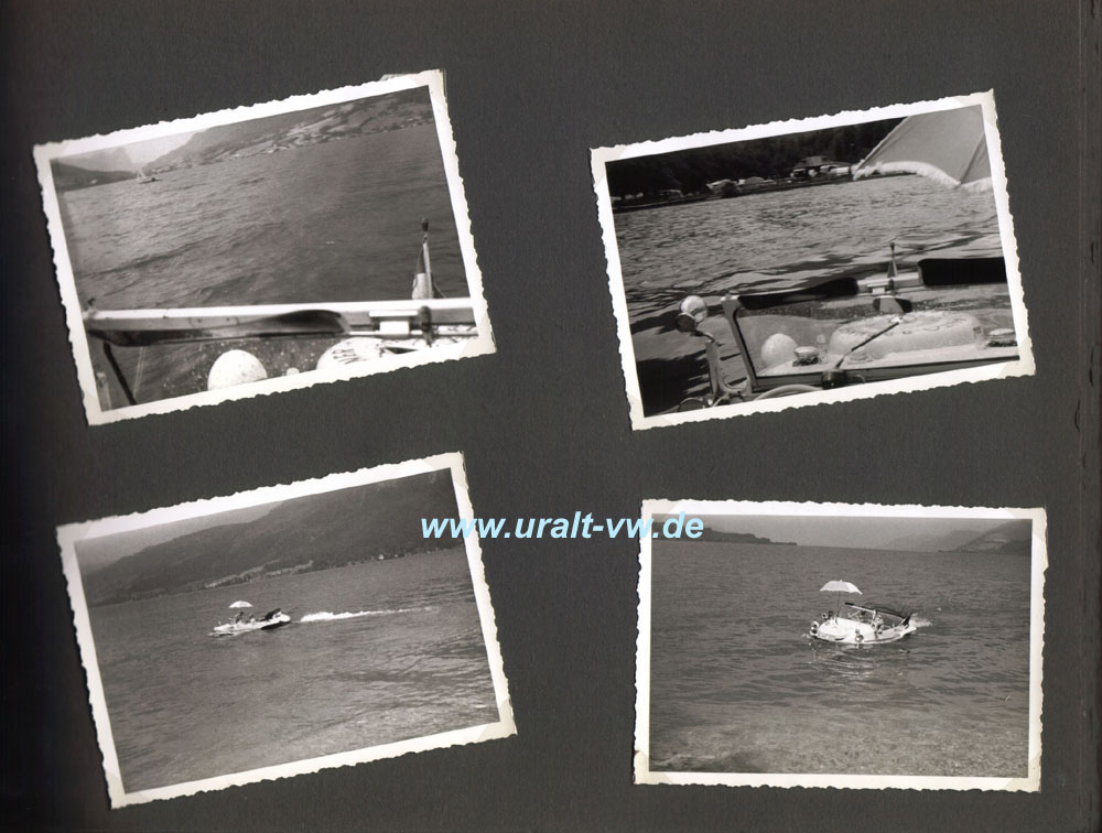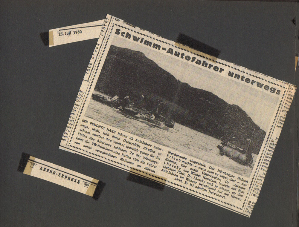 Das Fotoalbum handelt von einem Kölner VW Schwimmwagen namens “Purzel” und dessen Teilnahme am 1. Schwimmwagen-Fahrer-Treffen vom 22.-26. Juli 1960 in Burgau am Attersee (Österreich), sowie am 2. Treffen vom 09.-10. September 1961 in Paderborn. |