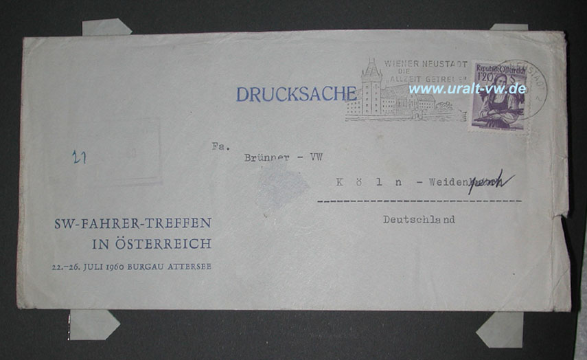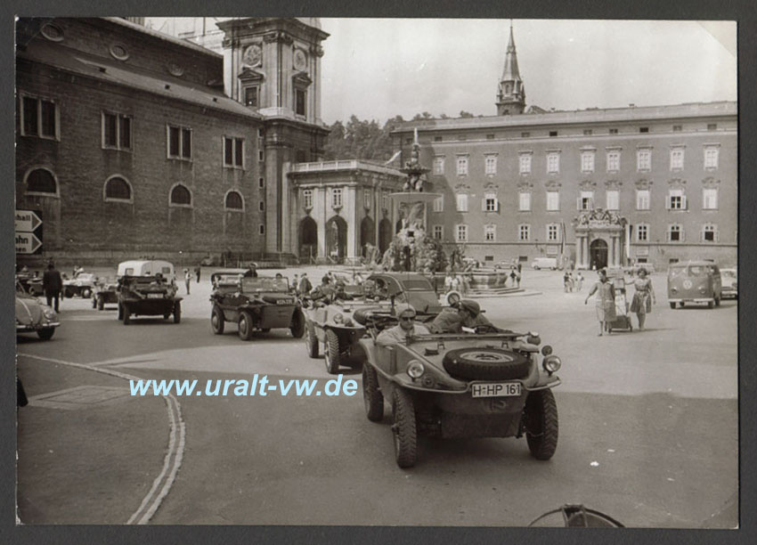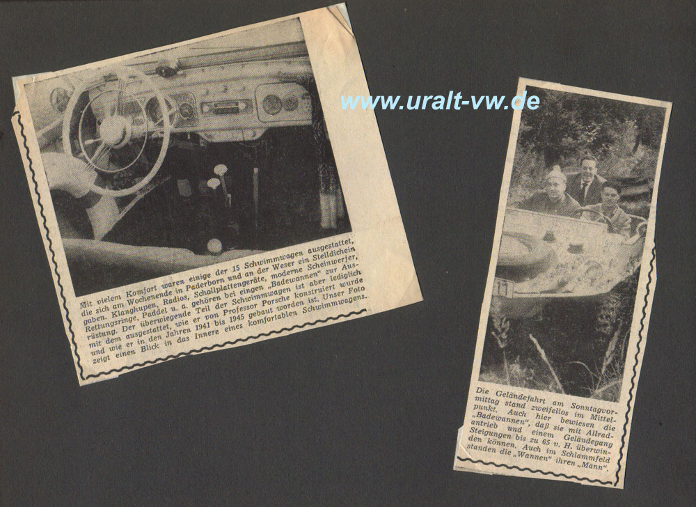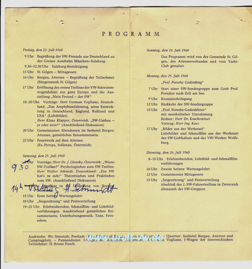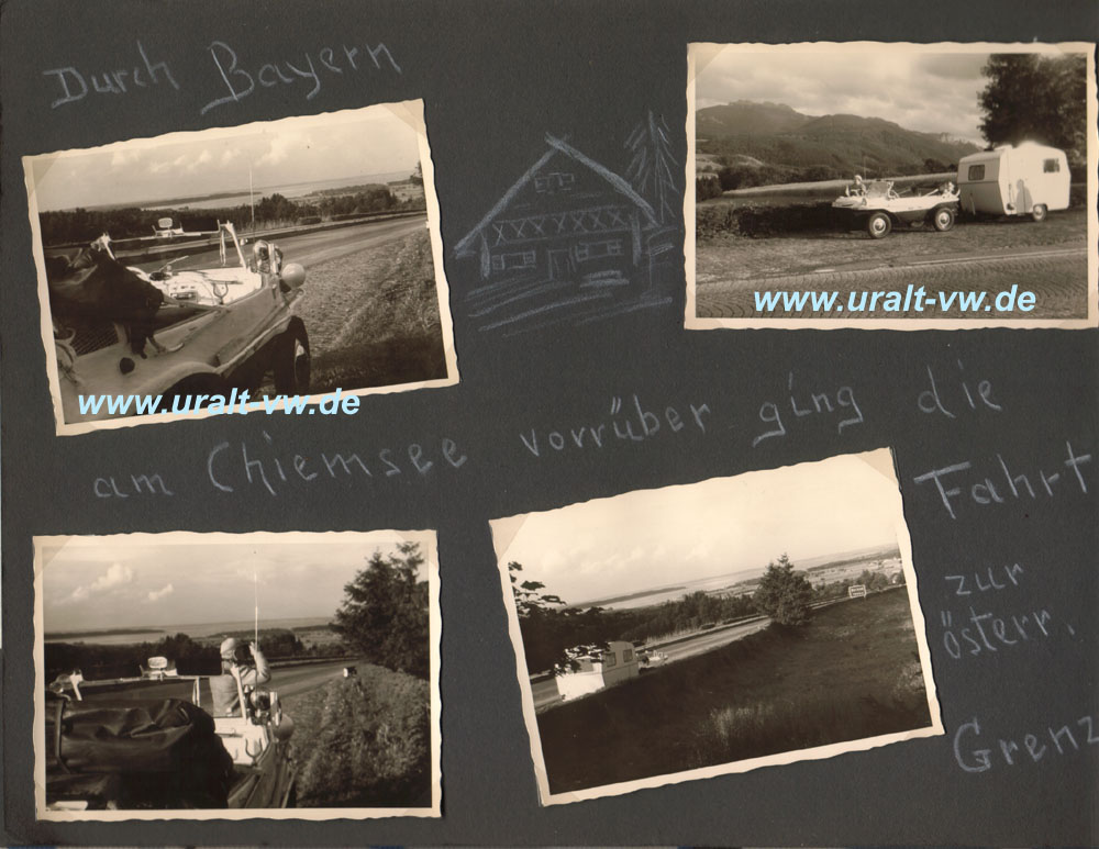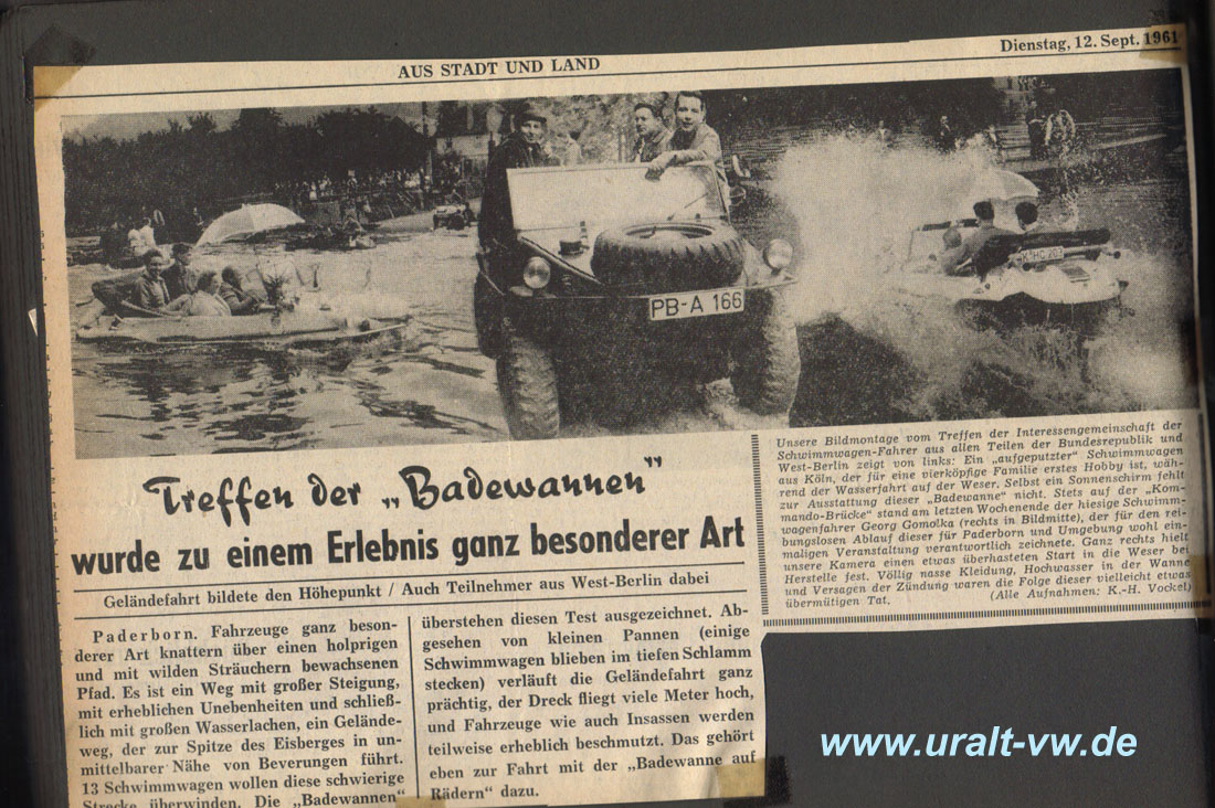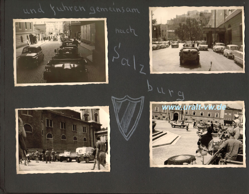 Das Fotoalbum handelt von einem Kölner VW Schwimmwagen namens “Purzel” und dessen Teilnahme am 1. Schwimmwagen-Fahrer-Treffen vom 22.-26. Juli 1960 in Burgau am Attersee (Österreich), sowie am 2. Treffen vom 09.-10. September 1961 in Paderborn. |