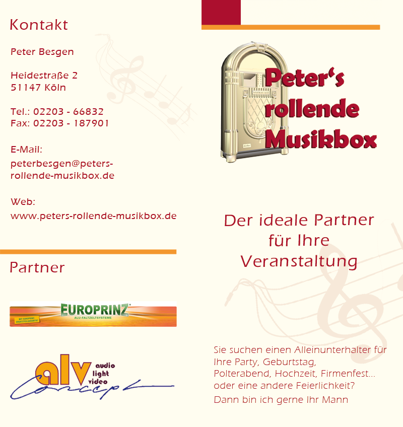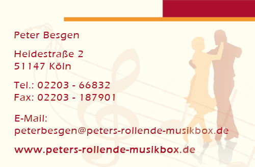 Peter Besgen Heidestraße 2 51147 Köln Telefon: +49 2203 66832 Telefax: +49 2203 187901 peterbesgen@peters-rollende-musikbox.de
