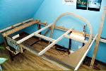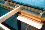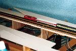 Die Anlage sollte in der offenen Rahmenbauweise erstellt werden, da diese leicht, gut zugänglich und auch während des Aufbaus variabel ist. Wohl wissend, dass eine passgenau in den Raum gebaute Großanlage "für alle Zeiten" gebaut und nicht transportabel ist, habe ich mich für den festen Einbau entschieden. Dies auch deshalb, weil transportable Module wegen des schmalen Treppenabgangs sehr klein ausgefallen wären. Beim Aufbau der Unterkonstruktion sollten Teile der alten Anlage aus Kostengründen mit verwendet werden. So stehen die Stirnseiten der Anlage auf der alten Holzkonstruktion aus Balken und gehobelten Dachlatten, welche zusätzlich an den Ecken versteift wurden. Zuerst wurde der untere Schattenbahnhof auf einer der alten Spanplatten aufgebaut und diese wo nötig mittels untergeklebter Dachlatten gegen Durchhängen gesichert. Untergrund für die Gleise bildet auf den nicht sichtbaren Strecken je eine Lage Panzerkarton. Die sich an den Schattenbahnhof anschließende Paradestrecke mit den „Neben-schauplätzen" für den Güterverkehr eine Ebene höher ruht auf einer Unterkonstruktion aus Lochblechprofilen, die miteinander und mit der Holzkonstruktion zur Aufnahme der Quersparren verschraubt wurde. Die Holzunterkonstruktion entstand durch je 2 winkelförmig verleimte Dachlatten (gegen Verformung bei Temperaturschwankungen), die ihrerseits dann mit den Dachlatten-Quersparren zur Aufnahme der Trassenbretter verleimt wurden. Der größere Bereich des Bahnhofsumfeldes wurde komplett auf eine 10 mm Sperrholzplatte gebaut - hier gibt es abgesehen von einer Straßenbrücke nur eine Ebene, die weitgehend mit Gleisen ausgefüllt ist. Im sichtbaren Bereich sind die Trassen mit einem Gleisbett aus Korkstreifen beklebt - bei größeren Weichenstraßen und im Bahnhof wurden handelsübliche Kork-Wandplatten aus dem Baumarkt verwendet. |