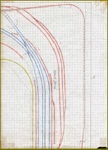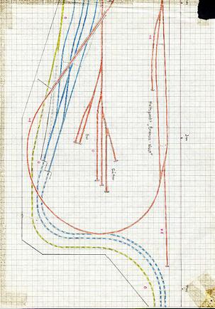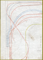 Beim endgültigen Gleisplan wurden die Radien vergrößert und einige Unterwegsbahnhöfe sind entfallen, da sie in Sichtweite des Hauptbahnhofs lagen; jetzt ist die Gleisführung zwar weit weniger „spannend" ( wo mag der Zug wohl jetzt erscheinen ?), dafür ist aber ein vorbildgerechterer Start- Zielbetrieb möglich und es wird weniger Material ( vor allem Weichen ) benötigt. |