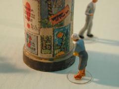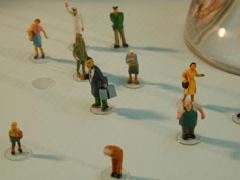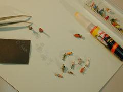 Eine lebendige Atmosphäre auf der Modellbahn wird nicht zuletzt durch Figuren erzielt - in der Modellbahnstadt und auf dem Land sollen auch „Menschen" leben und arbeiten. Sehr wichtig ist, diese Figuren nicht gleichmäßig auf der ganzen Anlage zu verstreuen, sondern in Gruppen zu arrangieren und etwas „erleben" zu lassen. Viele Figuren sind ja bereits bei den unterschiedlichsten Tätigkeiten zu beobachten und lassen sich leicht zu interessanten Szenen zusammenstellen. Einmal auf der Anlage befestigt, lassen sich die Figuren später nur noch schwer wieder entfernen, ohne Schaden zu nehmen; oft hat man die Figur in der Hand, während die Füße / Schuhe noch unverändert auf der Anlage haften. Gerade wenn Szenen öfters umarrangiert werden sollen, wie es auf der Brunau-Bahn der Fall ist, müssen die Figuren verschiebbar bleiben - Auf der Brunau-Bahn sollen später ja einmal Geschichten erlebt und erzählt werden. |