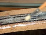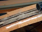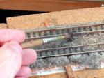 Die Kleister-Schottermischung wird großzügig auf den Schienen verteilt; die Böschung wurde mit Weißleim bestrichen, damit der Schotter hier sofort haftet. |