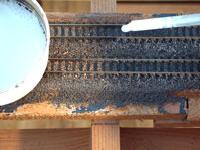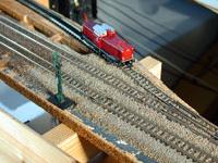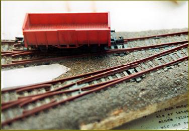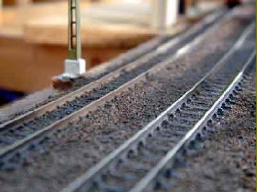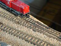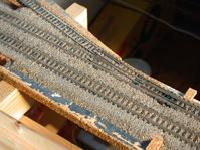 Im Bereich des Verschiebebahnhofs wurden noch 15 ° -Weichen verwendet und mit rostbrauner Farbe behandelt ( etwas Trockenfarbe soll den starken Rostton noch abschwächen. Auf den weiteren Strecken wurden die 10° -Weichen von ROCO eingebaut und dezent gealtert; hier wurden unterschiedliche Schotterfarben verwendet da die ersten Versuche etwas zu dunkel erschienen. Rechts wurde gerade der Abzweig von der Paradestrecke zur Güterstrecke eingeschottert. |