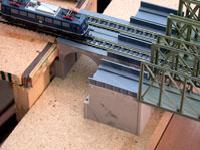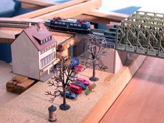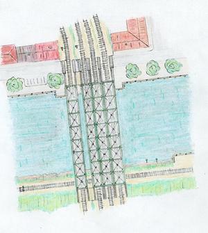 Der Fluss "Eich" wird im Stadtgebiet von Brunau von einer viergleisigen Eisenbahnbrücke überspannt - dazu wurde die Kastenbrücke von ARNOLD nebeneinander gesetzt und durch eine Bogen-Vorbrücke für den Straßenverkehr ergänzt; das Flussufer an der "Eichufer Straße" ist komplett mit einer Kaimauer versehen; zwischen Straße und Fluss liegt ein schmaler Grünstreifen mit Fußweg und vereinzelten Parkbuchten. Das gegenüberliegende Ufer fällt teilweise flach ab und grenzt an ein stillgelegtes und z.T. überwuchertes Industriegleis - im hinteren Teil folgt auch hier eine alte Kaimauer mit einem verrostenden Portalkran. Im vorderen Teil schließt sich später das Gelände der "Eisenbahnfreunde Brunau" an. |