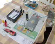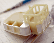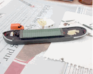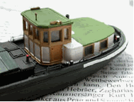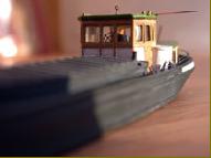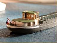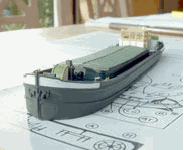 Der 120 Tonnen Rheinkahn besteht aus nur 3 Gusssteilen und einigen Zurüstteilen aus Messing; die Gusshäute der Aufbauten werden auf Schleifpapier abgeschliffen. |
