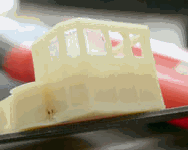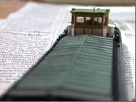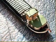 Inzwischen wurde der Schiffsrumpf angemalt und die Ladeluke aufgeklebt; die Bemalung der Kleinteile erfordert insbesondere bei starken Farbkontrasten etwas Geduld ( so mussten des Öfteren Patzer mit der jeweils anderen Farbe ausgeglichen werden ) - aus der normalen Entfernung des Betrachters sollte dies ohnehin nicht zu sehen sein. |