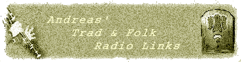 Audio & Video Player, free software Media player: SM Player VLC Media Player free and open source cross-platform multimedia player and framework that plays most multimedia files as well as DVD, Audio CD, VCD, and various streaming protocols. Real Player Audacity audio recorder see also: Andreas' Trad Music Links traditional music and dance link list Andreas' Songs & Ballads Links lyrics, folk song and ballads link list ![]() Many thanks for a link to Andreas' Trad & Folk Radio Links to: Folkclub Frankfurt (D) Folk-Treff Münster e.V. (D) ![]() Certain pictures on Andreas' Trad & Folk Radio Links are used with the kind permission of the editorial office of cantalpassion.com , a website dedicated to the Cantal region in France. contact: Andreas Heising Cologne, Germany last revised: May 2022 Any copyrighted material on this page is used in "fair use", for the purpose of study, review or critical analysis only, and will be removed at the request of copyright owner(s). |