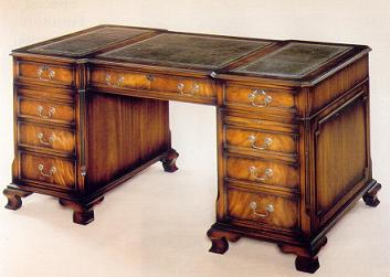 Dieser Schreibtisch besticht durch sein Format, wobei die Tischplatte gegenüber den üblichen Schreibtischplatten durch ihre Form auffällt.