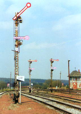 Die drei Ausfahrsignale C, D und J von Sourbrodt in Richtung Kaltherberg/Raeren jeweils mit Flügeln für große- und kleine Bewegung vor dem Stellwerk Cabine S1 rechts