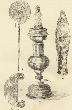 4) Rasiermesser aus Bronze; 5) Spiralkopfnadel aus Bronze.