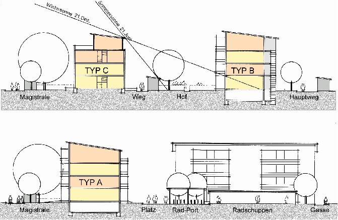 Die Entscheidung für die verschiedenen Wohnungstypen basiert auf der Lage der Gebäude im Gelände: Typ A bietet West-Ost orientiert die Möglichkeit von Wohnungen mit Morgen- und Abendsonne. Typ B ermöglicht eine Norderschließung vom Hauptweg aus und bietet sich daher für kleinere, direkterschlossene Wohnungen mit Südbalkon an. Typ C bietet Familienwohnungen als gestapelte Reihenhäuser mit Garten für die EG/1.OG Wohnung oder Dachterrasse nach Süden für die Wohnungen im 2.OG/Staffelgeschoss an.