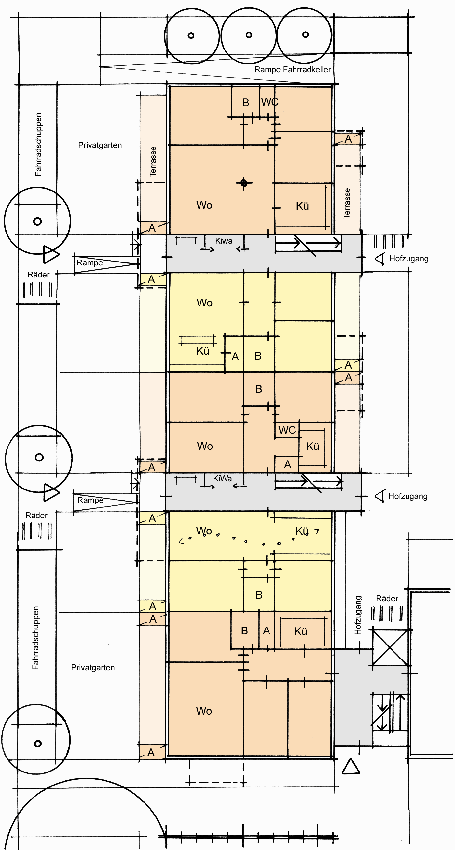 Hauptzugang von Westen, zusätzlicher Hofzugang nach Osten. Sitzplatz und Kinderwagenabstellmöglichkeit im Eingangsbereich. Ebenerdige Fahrradabstellanlagen und gemeinsamer, von außen über eine Rampe angebundener Fahrradkeller.
