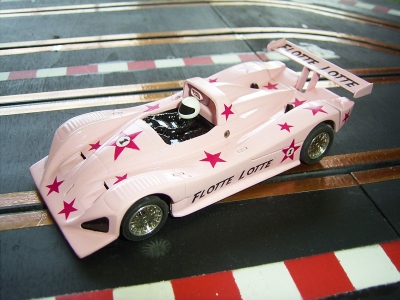 Wie bereits oben erwähnt habe ich bei diesem Modell versucht aus den Fehlern vom letzten Mal zu lernen. Über das Design des Autos kann man sich streiten, es handelt sich um eine "Auftragsarbeit" für meine Teamkollegin Lotte. Daher die gewackte Kombi "Pinke Sterne auf Rosa Lola". Die Arbeitsschritte an diesem Modell waren grundsätzlich nicht anders als beim Venturi: Modell in Einzelteile zerlegen, schleifen mit 800er-Schleif Papier, entfetten, grundieren, lackieren, Decals drauf, Klarlack und fertig. Für die Sterne habe ich diesmal weißes Decal-Inkjet-Papier benutzt. Damit sind die Sterne sehr farbecht geworden. Für die schwarze Schrift habe ich das klare Papier genommen. Dafür traten diesmal leider andere Probleme auf: Da ich das Modell im Winter in meiner Garage lackiert habe ist leider der LAck nicht perfekt geworden. Die Temperatur zum Lackieren war einfach zu niedrig. Insgesamt ist das Ergebnis doch ganz in Ordnung geworden. Lotte war auf jeden Fall mit dem Wagen zufrieden. Wenn Sie ihn jetzt noch ordentlich fahren würde....aber man kann ja nicht alles haben.