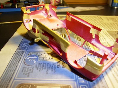 2. Lackierung Als zweite Farbe habe ich mich für den Farbton Gold-Leaf entschieden. Diesen habe ich mit dem Pinsel aufgetragen. Zum Abkleben habe ich das Marking-Tape von Tamiya benutzt. Meine vorherigen Versuche mit stinknormalem Malerkrepp aus dem Baumarkt waren nicht von Erfolg gekrönt. Ich habe im Netz auch von Problemen mit dem Marking-Tape von Tamiya gelesen. Bei mir hat es einwandfrei funktioniert und ließ sich ohne Problem entfernen. Die Grundlackierung wurde in keinster Weise beim Ablösen des Tapes beschädigt. Wahrscheinlich zahlen sich hier die großzügigen Trockenzeiten der einzelnen Arbeitsschritte aus. Auch den Goldenen Lack habe ich zwei mal aufgetragen. Dazwischen natürlich wieder alles ordentlich durchtrocknen lassen. Leider hatte ich an einer Stelle aufgrund des Malerkrepp unsauber gearbeitet. Den Metallic-roten Lack hatte ich aber nur zum Sprühen. Daher habe ich diesen auf eine Holzplatte aus nächster Entfernung aufgesprüht. Dadurch bildetet sich auf der Holzplatte ein kleiner Lacksee, welche ich zügig mit dem Pinsel an der zu korrigierenden Stelle auftragen konnte. |