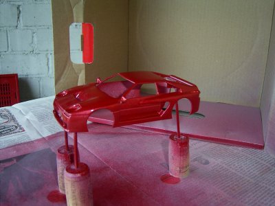 | Grundlackierung Als Grundlackierung habe ich mich für das Metallic-Rot von Tamiya in der Spraydose entschieden. Die erste Lackschicht habe ich dünn aufgesprüht und erst mal 12h eintrocken lassen. Die 2. Schicht hat dann problemlos gedeckt. |