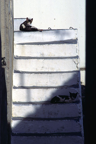 Straßenkatzen während ihrer Siesta in Othos, Karpathos