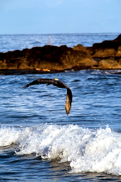 Ein Pelikan gleitet dicht über der Wasseroberfläche.