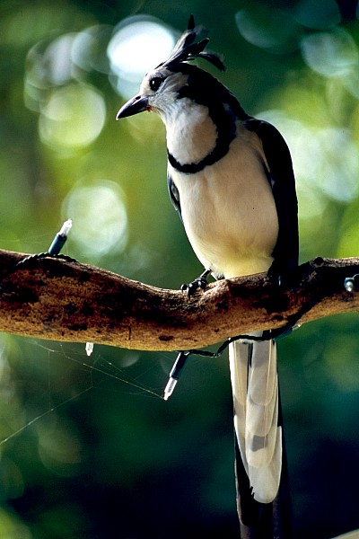 Ein Langschwanzhäher hat sich in der Weihnachtsdekoration niedergelassen.