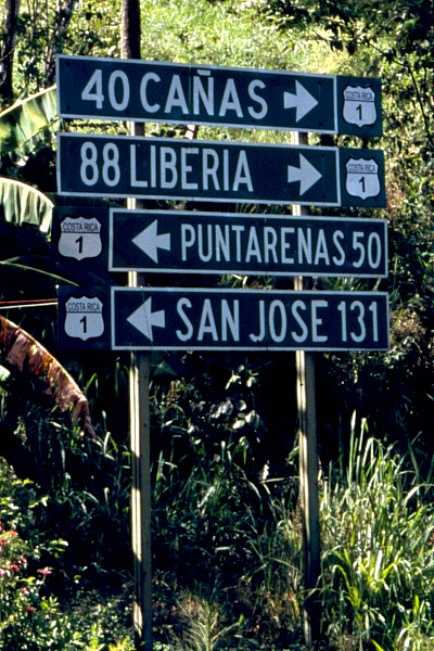 Der Highway No. 1, die legendäre Panamericana, verbindet Feuerland im Süden mit Alaska im Norden des amerikanischen Kontinents. An diesem Schild in der Nähe von Puntarenas zweigt eine holprige Piste zum Nebelwald von Monteverde ab. |