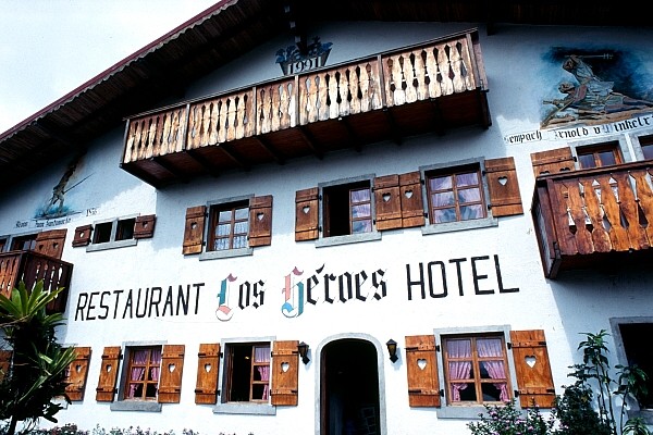 Das Hotel "Los Heroes" von Franz Ulrich. Zur linken der Nationalheld Costa Ricas Juan Santamaria, zur rechten der scheizer Nationalheld Arnold von Winkelried. |