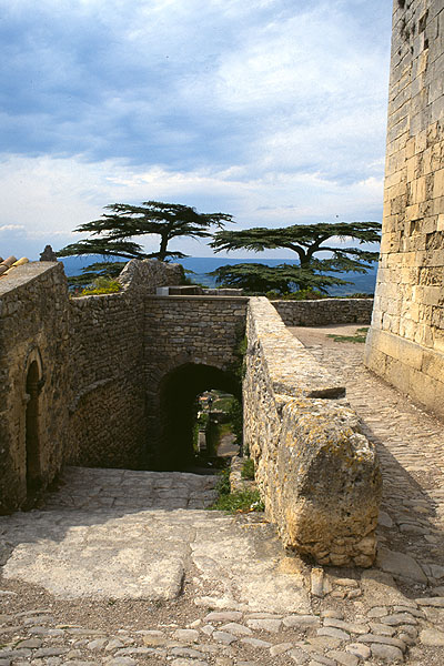 Zedern an der alten Pfarrkirche von Bonnieux. Die Treppe führt zur Terasse, von der man weit ins Land hinausblicken kann.