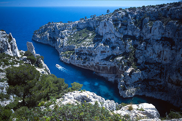 Blick in die Calanque En-Vau. Am Ende der Bucht lädt ein Kieselstrand zum Baden im glasklaren Wasser ein. Von dort führt ein steiler Weg hinauf zu der Stelle, an der dieses Bild entstanden ist. Kletterausrüstung empfohlen! |