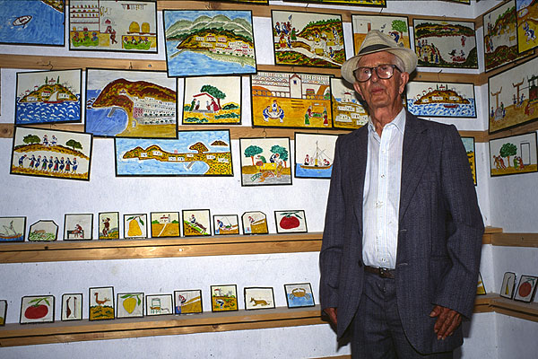 Wer das Bergdorf Othos besucht, kommt wohl nicht an dem alten Ioannis Hapsis vorbei. Der Neunzigjährige kam im Alter von elf Jahren von Olymbos nach Othos, als sein Vater nach einem schweren Erdbeben in Othos beim Wiederaufbau half. Ioannis arbeitete als Schuhmacher, Frisör und Lehrer. Außerdem war er einer der besten Lyraspieler der Insel. Als der Arzt dem herzkranken Ioannis vor ein paar Jahren riet, mit schwerer Arbeit aufzuhören, entschied er sich, seine Erinnerungen in Form naiver Bilder auf Holzplatten und Kacheln zu malen, die er in seiner kleinen Galerie verkauft. Nebenbei betreut er in Othos ein Heimatkundemuseum. Ioannis kann nun mal nicht untätig sein. |