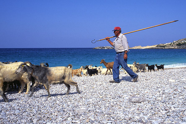 Ein Ziegenhirte treibt seine Herde über den Kieselstrand von Lefkos.