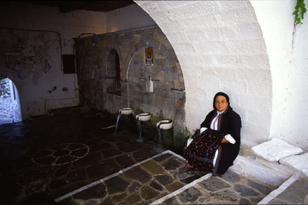 Unterhalb der Marienkirche in Mesohori entspringt eine Quelle, deren Wasser zuerst in drei Becken und aus diesen dann über den Boden in eine Auffangrinne fließt. Von dort wird das Wasser durch oberirdische Rinnen durch den Ort in die Gärten geleitet |