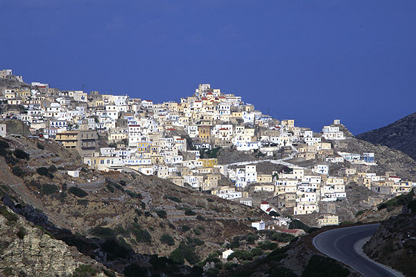 Olymbos im Norden von Karpathos ist praktisch vom Rest der Insel isoliert. Auf dem Landweg erreicht man Olymbos nur von Spoa aus über eine nicht ganz ungefährliche ca. 20 km lange unbefestigte Piste. Eine andere Möglichkeit nach Olymbos zu gelangen ist der Seeweg. Von Pigadia aus erreicht man in ca. 1,5 Stunden den Hafen von Diafani. Von dort aus sind es nochmals ca. 7 km Fußmarsch durch ein ausgetrocknetes Flußbett in die Berge oder man nimmt einen Pendelbus, der vormittags und nachmittags auf der asphaltierten Straße zwischen Diafani und Olymbos verkehrt. |
