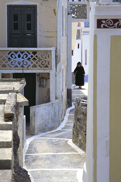 Wie in den meisten Orten auf Karpathos sind die Häuser in Olymbos dicht aneinander gebaut. Die engen Gassen, die oftmals nur über Treppen miteinander verbunden sind, lassen motorisierten Straßenverkehr nicht zu. Lasten werden mit Maultieren oder einfach auf dem Rücken befördert. In der Mittagssonne spenden die Hauswände Schatten und Kühle. Einheimische sieht man dann nur selten. Zum einen ist es mittags viel zu heiß, zum anderen laufen die Tagestouristen durch den Ort. |