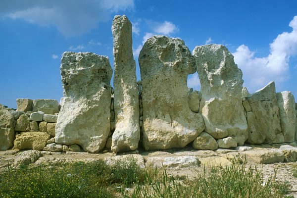 Der Tempel von Hagar Quim befindet sich ca. 500 m neben Mnaidra. Man kann heute nur mutmaßen, wie die Menschen vor 5000 Jahren 20 Tonnen schwere Steinkolosse bewegt haben. |