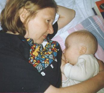 | Ich habe Elias ein halbes Jahr voll gestillt und dann langsam andere Nahrung eingeführt. Auch das war wichtig, denn manchmal kann es Probleme beim Übergang auf feste Nahrung geben, wenn man die sensible Phase dafür verpaßt. Hier hatten wir eine kompetente Krankengymnastin, die uns aufmerksam gemacht hat auf diesen Zusammenhang. |