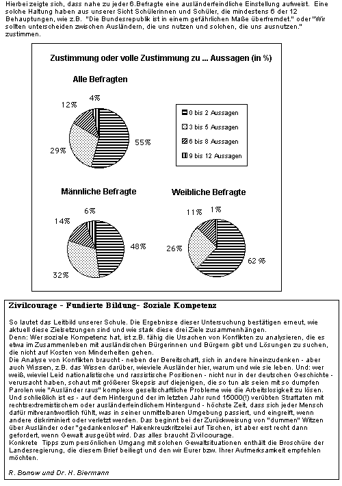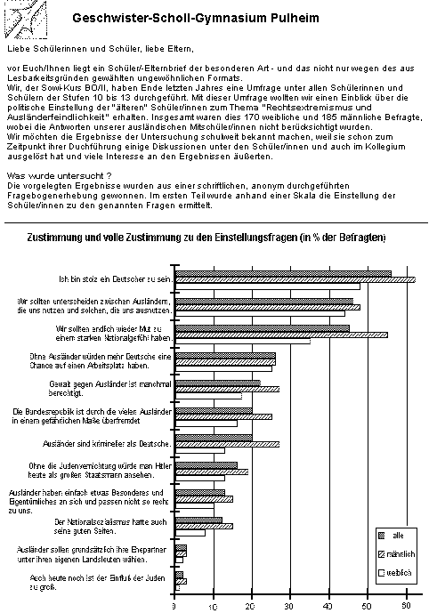 Die Schulöffentlichkeit wurde durch den folgenden Schüler-/Elternbrief über die Umfrageergebnisse informiert. Zusammen mit dem Brief wurde ein Faltblatt des Innenministeriums des Landes NRW verteilt. Weitere Informationen zu den Aktivitäten der Landesregierung gegen Rechts finden Sie unter:
